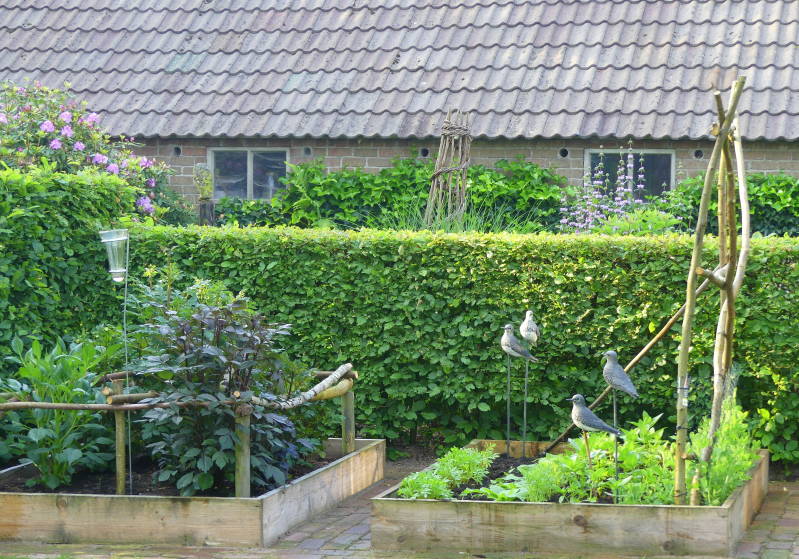 Raum und Ruhe charakterisieren unseren Hof. Hecken und Rabatten in lockerem Stil mit besonderer Bepflanzung bestimmen die Struktur des Gartens. Rasen, Beeten und Gartenzimmer, zwei kleine Obstgärten, ein Vogelwäldchen, ein Krötentümpel … und mehr.