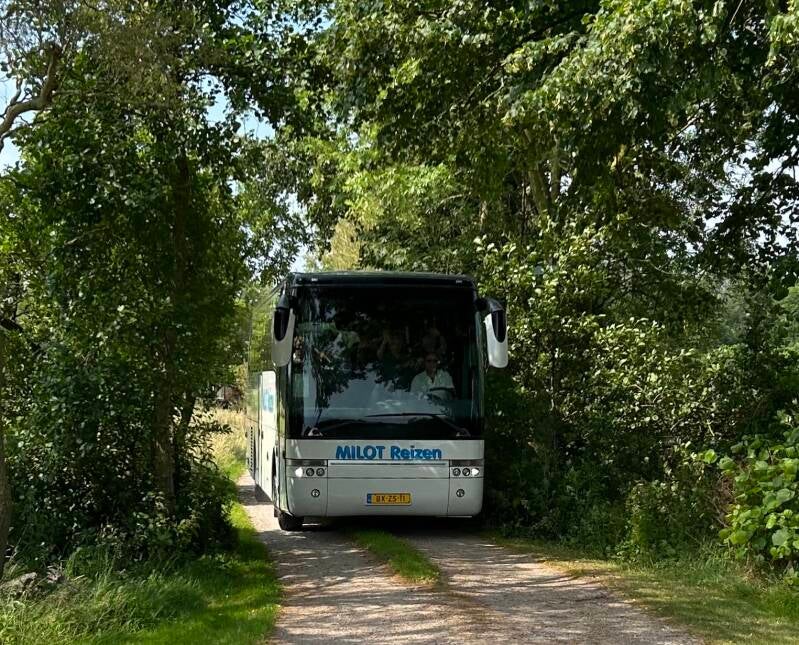 Grote gezelschappen bezoeken onze tuin met een touringcar. Voor de chauffeur is het een leuke uitdaging om de bus met de tuinliefhebbers zo dicht mogelijk bij onze tuin te parkeren.