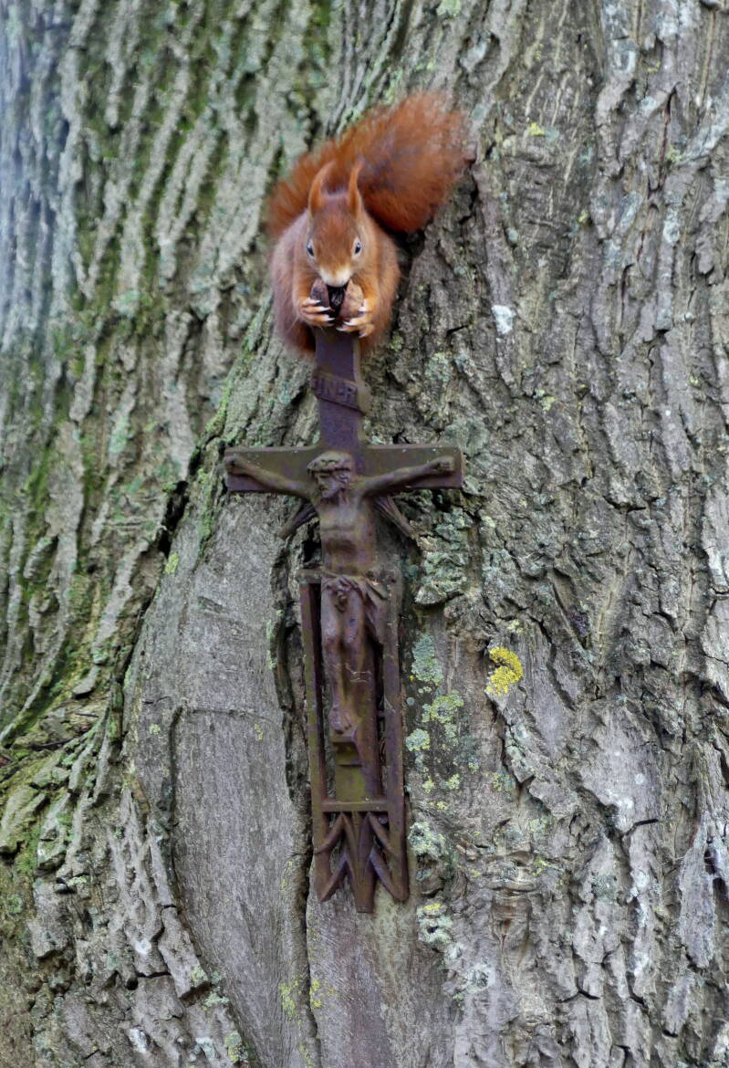 In het najaar verschijnt de eekhoorn en hij of zij zoekt walnoten onder de 15 meter hoge walnoot. We vinden ze daarna door de hele tuin verstopt als voorraad voor later.